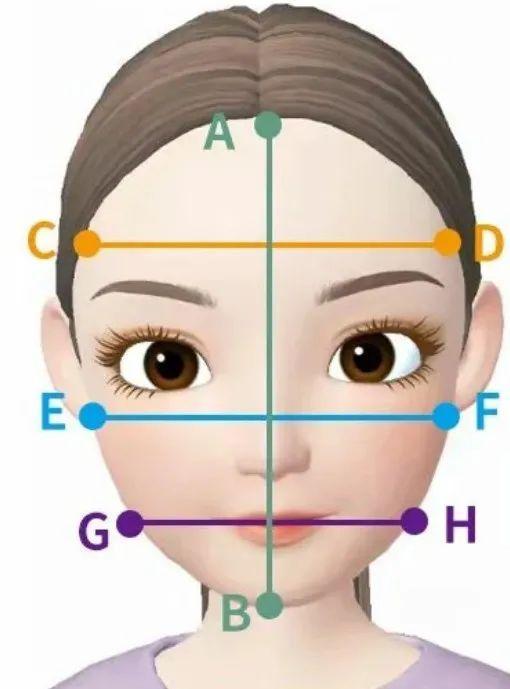 然后找到额头中心点(A)、额头两侧两个点(C/D)、颧骨两个点(E/F)、咬肌两个点(G/H)、下巴中心点这8个点(B),用线连起来。